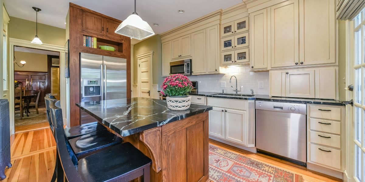 No detail is overlooked in the stunning modern kitchen with its custom cabinetry, strikingly veined soapstone countertops, substantial oak island, and subway tile backsplash.